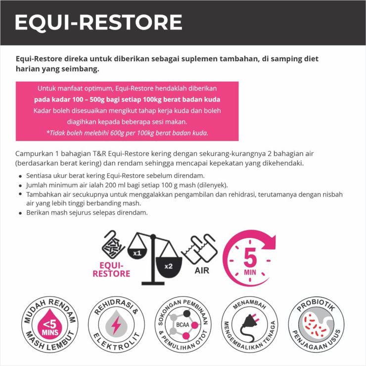 Campurkan 1 cawan (250 g) Equi-Restore dengan 2 cawan (250 g setiap satu) air. Rendam selama 5 minit sebelum diberikan kepada kuda.
